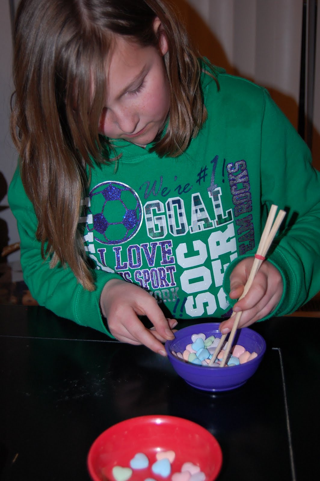Once the main meal was completed, it was time for dessert. Dessert consisted of Love Potion and homemade chocolate and strawberry truffles. We decided to try to switch gears and calm things down a bit, so we handed out the dessert, turned off the lights and lit some candles. Wow, now that made a difference. After we were all settled down in the candlelight, we talked about LOVE. We talked about God's commandments to love Him and others. Then, we asked if they could quote any verses about love or sing any songs about love. It was so cute. Laila began singing "Old MacDonald." Then, I asked her, can you sing "Jesus Loves Me?" She did, and it was adorable. Each February, I challenge the kids to memorize 1 Corinthians 13 to win a prize. Rick read it to us.